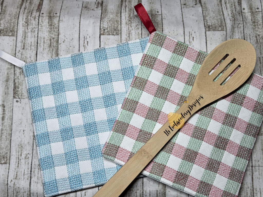 Check out the plaid potholders all made in the hoop of your embroidery machine! No sewing!! Really quick and easy to make. The first potholder design is made with one thread color to make the plaid and the second potholder has a stop after the horizontal plaid stitching so you can change to a different thread color for the vertical plaid stitching!