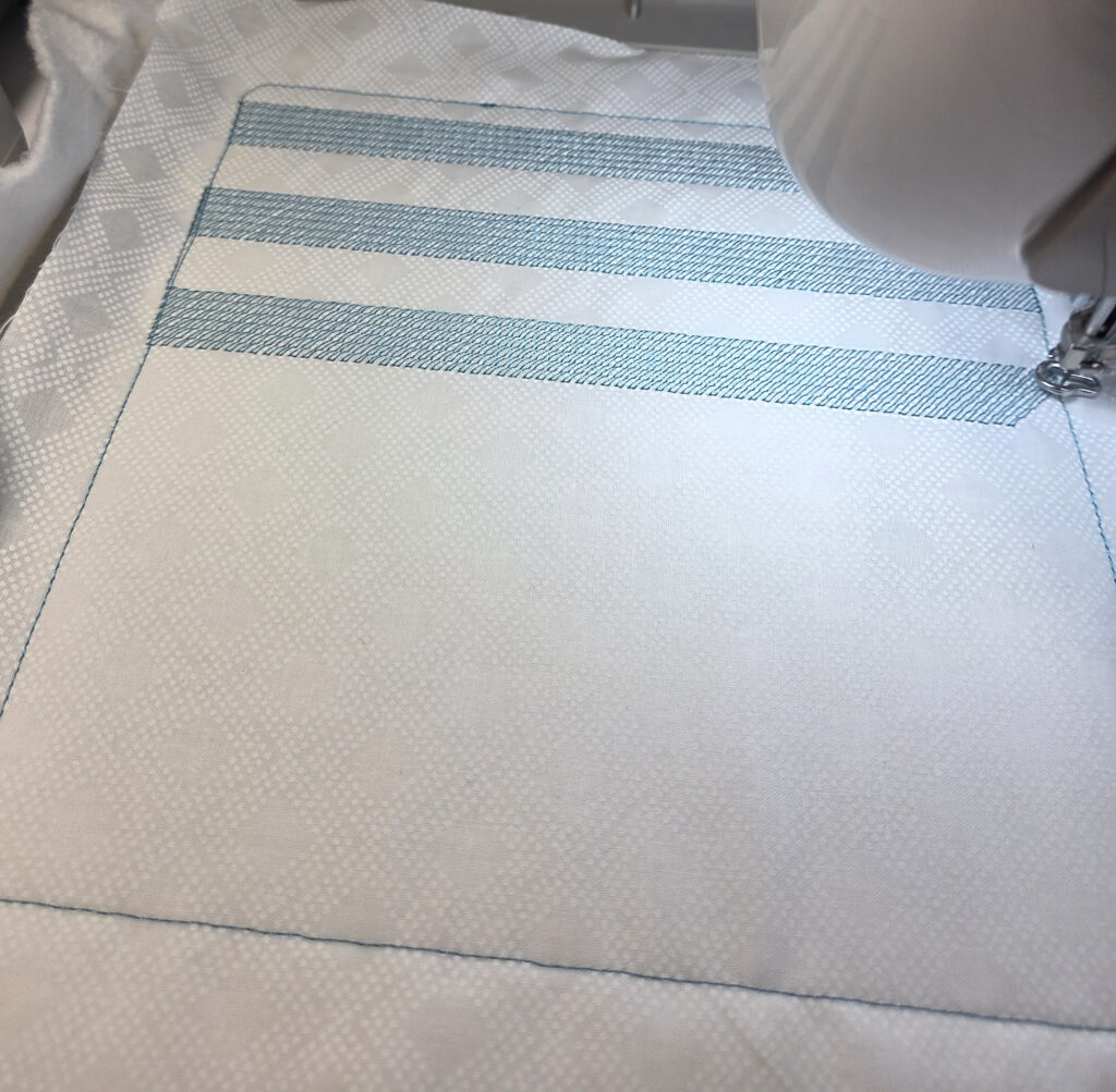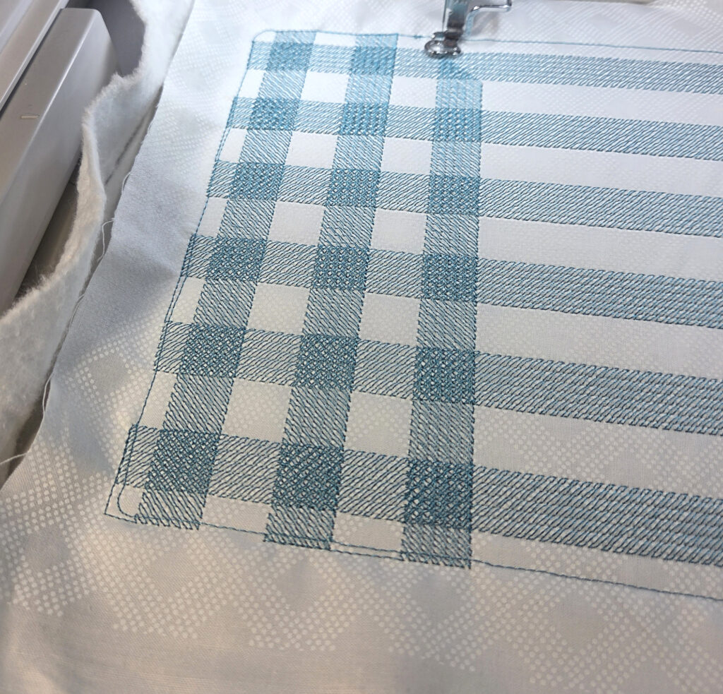 So let’s head to the “laboratory” and see what might work. Stitching that looks like plaid seemed the way to cover. It doesn’t require full stitch coverage and I could have one color thread going in the horizontal direction and another color thread going in the vertical direction. Best of all, it could be all one color thread without any big changes.